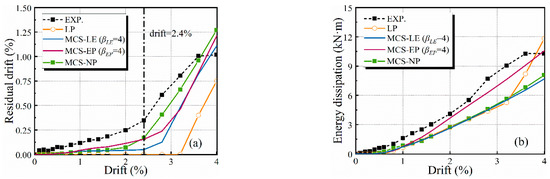 The energy dissipation comparison results between the test and numerical simulation with four contact spring models are shown in Figure 18b. It can be seen from Figure 18b that, in general, all models underestimate the energy dissipation of the pier as well, with the MCS-EP model showing relatively superior prediction results compared to the other models. At 4.0% drift, the difference between the simulation and test results for the MCS-EP model is only 2.7%, while that for the MCS-LE, MCS-NP, and LP models is 25.3%, 21.5%, and 14.9%, respectively. In addition, note that at large drifts, the energy dissipation amount simulated by the LP model has a sharp increase trend, and at 4.0% drift, it even exceeds the test results. This is because the ‘self-centering’ material (see Figure 5) used in the LP model neglects the effect of degraded reloading stiffness during cyclic loading, which would overestimate the area of the force–drift curves (i.e., energy dissipation capacity).
