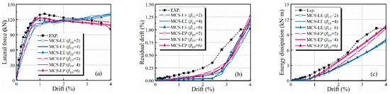 A similar comparison is also presented for the hysteretic response of the three MCS models, as shown in Figure 16b, d. Note that for the MCS-LE and MCS-EP models, the simulation results are given for three stiffness modification factor values of 2, 4, and 6, since all of them are close to the experimental data. It can be seen that the results in all these MCS cases show good agreement between the experimental and numerical results in terms of hysteretic responses. This means that the range of [2,6] is appropriate for both βLE in the MCS-LE model and βEP in the MCS-EP model. However, it is worth mentioning that, differing from the MCS-EP and MCS-NP models, which consider a degradation of the contact spring stiffness (i.e., smaller post-yielding contact stiffness), the constant contact stiffness in the MCS-LE model leads to an increasing trend in the lateral force, and thus, it exhibits a greater force than the experimental results, especially when the drift exceeds 3.0%.