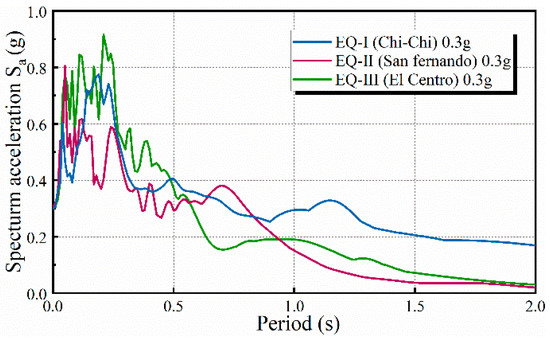 Three horizontally recorded ground motions in the shaking table tests [32] were used as inputs for the seismic evaluation in numerical simulations. The ground motions were consistent with the design response spectrum and were scaled to 0.3 g. Figure 21 and Figure 22 show the acceleration time histories and response spectra of the ground motions with a peak ground acceleration (PGA) of 0.3 g, respectively. These three ground motions are, respectively, the 1999 Chi-Chi, 1971 San Fernando, and 1940 Imperial Valley (El Centro station) earthquakes. More details of these ground motions are given in Shen et al. [40]. Moreover, the predominant period of the input motion is 0.32 s, which is closed to the fundamental period of the test specimen.