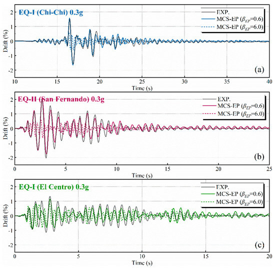 Comparison of the drift response histories between the test and numerical results under (a) EQ−I; (b) EQ−II; and (c) EQ−III.