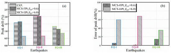 Comparison between the test and numerical results: (a) peak drift; (b) error of the peak drift.