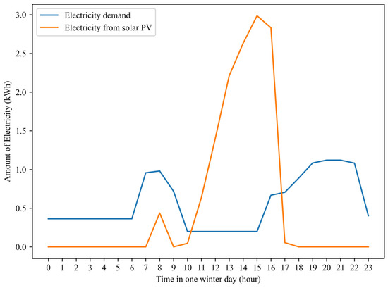 Solar PV is generally integrated with a storage battery to improve the stability of the energy utilization of the solar PV generation system [10]. Figure 1 shows the electricity demand and solar PV generation of a detached house on one winter day. Because solar radiation is an uncontrollable environmental factor, the real-time electricity generation from solar PV is unstable. The real-time electricity demand of a house also varies with its functions and environmental changes. Hence, a solar PV and battery integrated system can be deployed to mitigate the above fluctuations. The batteries can store the electricity when electricity from solar PV is greater than the electricity demand from the house, and provide electricity when electricity demand cannot be satisfied from solar PV.