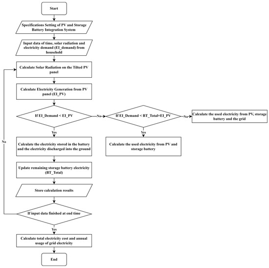 Figure 2 shows the mathematical model of the PV and battery integrated system, where EI_Demand represents the hourly electricity demand of the house, EI_PV is the hourly PV-generated electricity, and BT_Total refers to the remaining electricity in the storage battery. In Figure 2, the size specifications of the integrated system should be defined first. Then the file for the hourly solar radiation and hourly electricity demand of the house for one year needs to be input. The generation and consumption of the electricity are analyzed hourly with an iteration loop. If the real-time electricity demand for the house is smaller than the real-time PV generation, the excess electricity will be stored in a storage battery. When the storage battery is full, the rest of the electricity will be discharged to the ground. If the real-time electricity demand of the house is larger than the real-time PV generation, the stored electricity in the battery will be used. If the real-time electricity demand of the house is over the sum of the real-time PV generation and the remaining electricity in the battery, the system will purchase electricity from the grid. Hourly electricity usage conditions over the entire year are calculated and recorded using an iteration loop. When the iteration is finished, the annual total electricity cost and yearly grid electricity used are obtained.