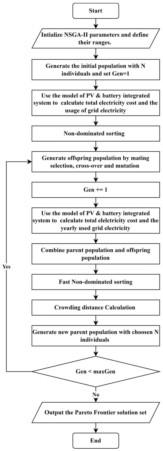 NSGA-II is one of the most popular multiobjective optimization algorithms and it can converge to a good spread of solutions near the Pareto optimal front. This work used the Python package Pymoo (version 0.6.1) to deploy NSGA-II to find three optimal size specifications of the integrated system (the area of PV, the installation angle of PV, and the capacity of the storage battery) [29]. The model of the PV and battery integrated system was used as the evaluation function to calculate the total electricity cost and usage of the grid electricity. A float random sampling method was used to create the initial population with a size of 100 individuals, and the size of offspring was set to 30. Simulated binary crossover (SBX) and polynomial mutations (PMs) operators were used with a crossover probability of 0.7 and a mutation probability of 0.9 [30]. The detailed calculation process is shown in Figure 3. First, the NSGA-II parameters had to be initialized, and the constraint ranges of the size specifications of the PV and battery integrated system had to be determined. Then the initial population was created, in which the randomly sampled size specifications were encoded into the genes of the N individuals in the initial population. Next, the mathematical mode of the integrated system was used as the fitness function to calculate the total electricity cost and usage of grid electricity for all individuals. With the total electricity cost and usage of grid electricity of all individuals, the population was sorted using nondominated sorting, after which the iteration was started. The first offspring population was generated through mating selection, crossover, and mutation operations. Then, the mathematical model of the PV and battery integrated system computed the total electricity cost and usage of the grid electricity of the offspring population. Next, the offspring population combined with the parent population, and fast nondominated sorting was carried out, and the crowding distance was computed. Based on the sorting and crowding distance, a new generation population could be created by choosing N individuals from the combination of the parent population and offspring population. Finally, the iteration criteria for whether the maximum iteration generation was achieved were checked. If the iteration criteria were not satisfied, the iteration loop continued, and if the criteria were satisfied, the obtained optimal solutions were output.