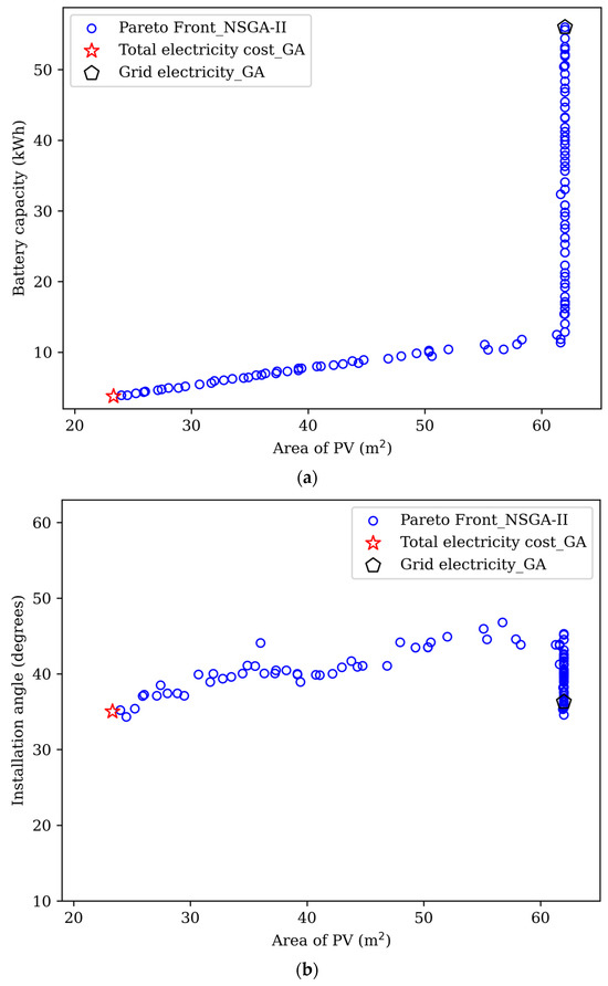 Visualization of optimal solutions obtained from NSGA-II and the two single-objective GAs. (a) Area of PV vs. Battery capacity, (b) Area of PV vs. Installation angle, (c) Battery capacity vs. Installation angle.