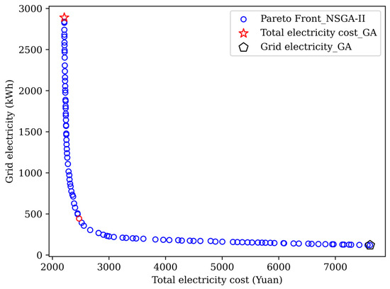 Figure 4 shows the optimal solutions of the deployed genetic algorithms. In Figure 4, the blue circles represent the Pareto front solutions of the NSGA-II. The red five-pointed star represents the optimal solution of the single-objective GA for the total electricity cost and the black pentagon represents the optimal solution of the single-objective GA for the usage of grid electricity. The installation angle of the PV in the Pareto front solutions varied from 35 to 47°, which was significantly smaller than the initial installation angle range. The areas of PV in the Pareto front solutions varied from 23 to 62 m2 and the capacity of the storage battery varied from 3 to 55 kWh. Both of the ranges almost coincided with the initial settled range, which demonstrated the ideal spread distribution of the Pareto front solutions for these two specifications. The optimal installation angle of PV for the two single-objective GAs was near 36°. In contrast, the optimal area of PV and the optimal capacity of the storage battery for the single-objective GAs was the opposite of this and was located at the two ends of the Pareto front solution. The simulation results for the optimal solutions of NSGA-II and the two single-objective GAs are shown in Figure 4 with abbreviations similar to those in Figure 3. The simulation results for the optimal solutions of NSGA-II and the two single-objective GAs are shown in Figure 5 with the legend labels similar to those in Figure 4. The simulation results for the two single-objective GAs are also located at the two ends of the simulation results of NSGA-II, and the distribution of the total electricity cost and the usage of grid electricity from the Pareto front solutions are continuous and spread. When the total electricity cost is less than CNY 3000, the used grid electricity greatly decreases from 2800 to 246 kWh. Then the grid electricity used slowly decreases to 119.7 kWh, while the total electricity cost rapidly increases to CNY 7612. In all simulation results for NSGA-II, the red circle shown in Figure 5 is chosen as the optimal solution considering the trade-off between economic and environmental benefits.