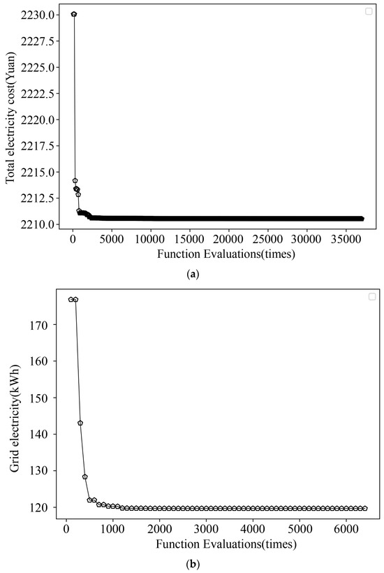 Convergence processes of three genetic algorithms: (a) Single-objective GA for total electricity cost; (b) single-objective GA for the usage of grid electricity; (c) NSGA-II.
