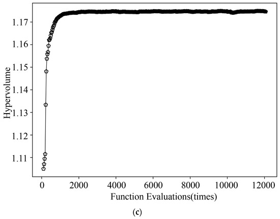 The Pareto front approach considers the varying importance of the various objectives simultaneously and offers insights about trade-offs between the alternative choices [31,32]. The deployed NSGA-II utilized the Pareto front approach to derive the optimal solution set. The true Pareto front was unknown, and NSGA-II and other evolutionary algorithms could only generate its approximation with the iteration of the generation. The hypervolume was the performance indicator of the derived Pareto front optimal solution, and it was based on the volume between the solution provided and the predefined reference point. The value of the reference point had to be greater than the maximum value of the Pareto front. As discussed in Section 3, the hypervolume was used to analyze the convergence of NSGA-II.
