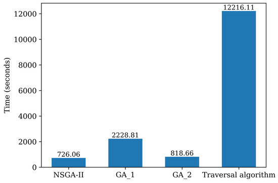 All three deployed genetic algorithms cost much less computational time than the traversal algorithm. As shown in Figure 6, all of the genetic algorithms obtain stable optimal solutions after around 2000 evaluations. Figure 7 compares the specific running time of the three genetic algorithms with the traversal algorithm. In this case, even if the solutions provided by the traversal algorithm are only accurate to the integer level, 116,100 evaluations are needed. The gap in the number of evaluations highlights the time-saving characteristics of the genetic algorithms. The sampling interval of the traversal algorithm can be limited by the curse of dimensionality, while the genetic algorithms can offer accurate optimal solutions.