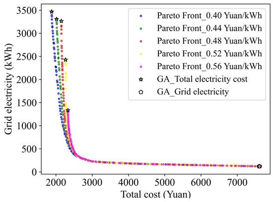 To test the robustness of the deployed NSGA-II to the fluctuating grid prices, five types of grid prices are utilized in Figure 8. The colored circles represent the simulation results from the Pareto front solutions of NSGA-II. The five-pointed star and pentagon represent the optimal simulation results from two GAs for various grid prices. When the grid prices vary from CNY 0.40 to 0.56/kWh, the optimal simulation results for the two GAs are still located at the two ends of the optimal simulation results of NSGA-II. The optimal simulation results for the GA for the yearly grid electricity used stay in similar positions, while the optimal simulation results of the GA for the total electricity cost and the optimal simulation results for NSGA-II with the low total electricity costs shift to the right and decrease gradually.