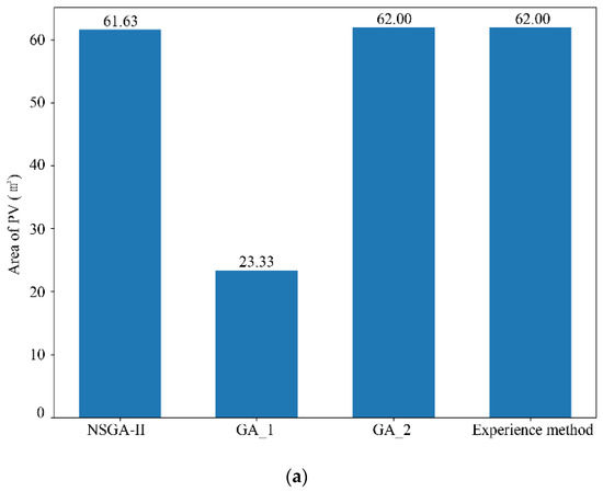 Figure 9 compares the optimal solutions from three genetic algorithms and the experience method. For the area of PV, NSGA-II and the GA for grid electricity choose large values that are similar to that of the experience method, but the GA for total electricity cost uses only a 23.3 m2 solar PV area, which is near the low bound of the area of PV. NSGA-II and the GA for total electricity cost use a much smaller battery compared to the GA for grid electricity and the experience method. The optimal installation angles of the two GAs are similar and close to 36°, which is slightly lower than that of NSGA-II (43.9°) and higher than that of the experience method (26°). In all, the optimal solution of the experience method is similar to the optimal solution of the GA for lower usage of grid electricity, which shows its trend to use more solar energy.