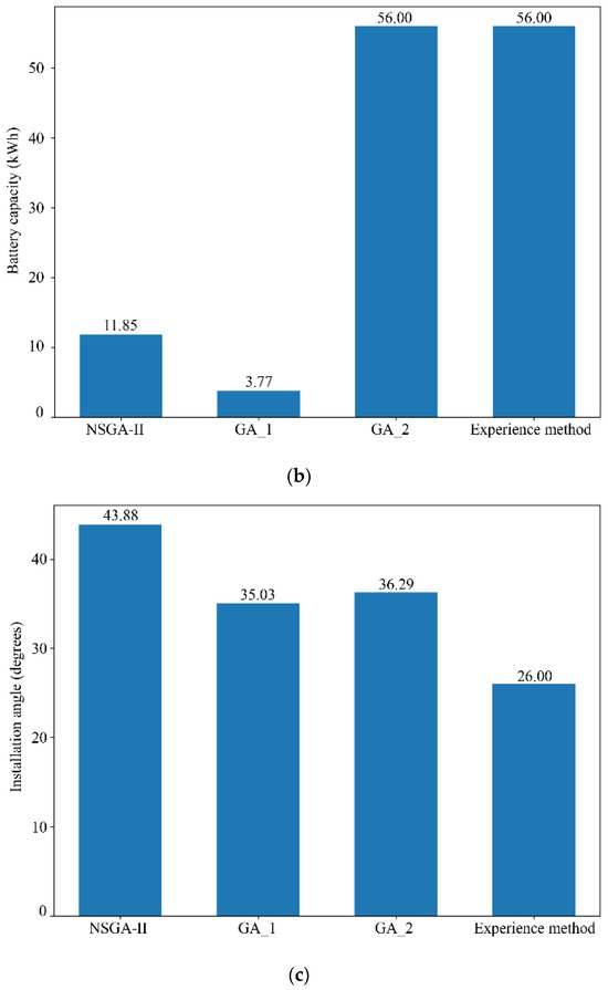 A comparison of the optimal solutions obtained from the experience method and three genetic algorithms. (a) Suggested areas of PV, (b) Suggested battery capacity and (c) Suggested installation angle of PV offered by four methods are illustrated. GA_1 represents the single-objective GA for total electricity cost, and GA_2 represents the single-objective GA for usage of grid electricity.
