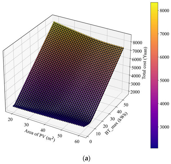 Figure 10 and Figure 11 clearly illustrate the difference between the genetic algorithms and the traversal algorithms. Figure 10 shows the traversal results, in which PV_waste represents the wasted electricity for PV-generated electricity over the sum of electricity demand and the rest capacity of the storage battery. Because the optimal solutions for both total electricity cost and yearly usage of grid electricity have almost the same optimal installation angles for PV and the optimal angle does not vary with the area of PV and battery capacity, only the area of PV and the battery capacity are used as variables. As shown in Figure 10, the total electricity cost increases with the battery capacity and the area of PV. This cost is significantly smaller when the battery capacity is lower, reflecting the greater effect of the battery capacity on the total electricity cost compared to the area of PV. The used grid electricity decreases as the area of PV increases. When the battery capacity is less than 10 kWh, more grid electricity is used for the suppressed ability of the battery to store and reuse electricity. PV_waste can be zero if the areas of PV and battery capacity are chosen properly. The largest area of PV and the smallest battery capacity is the worst situation that results in the largest amount of PV_waste.