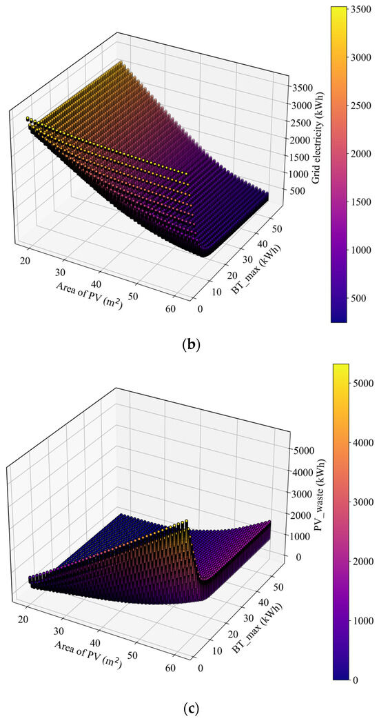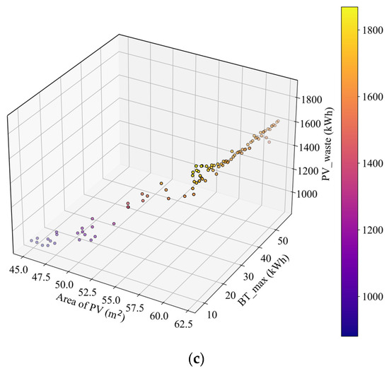 Figure 11 shows the simulation results for NSGA-II, and this figure uses the same legend as Figure 10. It is clearly shown that NSGA-II requires much fewer evaluations than the traversal algorithm. As shown in Figure 11a,b, the Pareto front simulation results almost coincide with the edges of the solution space in Figure 10a,b, in which the total electricity cost and the used grid electricity have the lowest values. In Figure 11c, the largest value for PV_waste is smaller than 1600 kWh, which is much smaller than the maximum amount of PV_waste in Figure 10c, and all Pareto front solutions avoid the two extreme cases of a large area of PV with a small battery capacity or a large battery capacity with a small area of PV. Additionally, the interval of parameters for the traversal approach in Figure 10 is one, which only offers integer solutions, while NSGA-II can offer accurate decimal solutions. All of this confirms the accuracy and time-saving of the deployed NSGA-II.