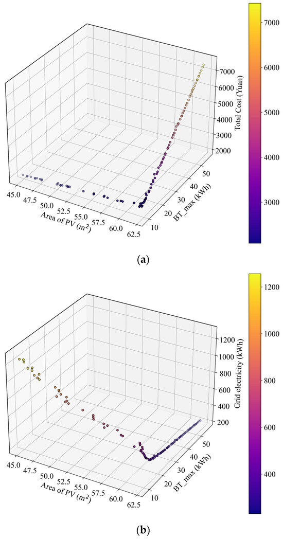 - The traversal algorithm is inefficient and limited to integer solutions. NSGA-II intelligently bypasses unreasonable parameter ranges, aligning with the traversal algorithm’s solution space edges where total electricity cost and grid electricity usage are minimized.