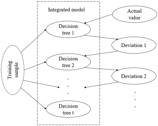 As shown in Figure 1, XGBoost belongs to a type of boosting tree model. Initially, a tree independently predicts a value based on the actual value and then obtains the deviation between the actual and forecast values. After that, the deviation is used as the actual value of the second tree, and new deviations are continuously obtained. When t trees are added,
