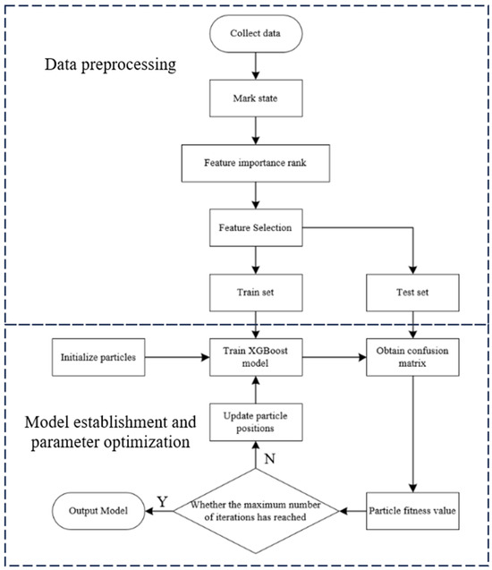 Figure 2 shows the flowchart for training a fault diagnosis model, which includes two parts: data preprocessing and the optimization of the model. Data preprocessing includes reading data from a database, adding labels, feature selection, and dataset splitting. In the model optimization, the training set and particle positions are used to establish the model, while the test set is input into the model to obtain the confusion matrix, which can evaluate the model. Based on the overall diagnostic accuracy of the model, the performance is evaluated. The evaluation indicators of the model are taken as the fitness function of the particles and the particle positions are adjusted according to Equations (9) and (10). The particle positions are repeatedly updated to establish the diagnostic model until the maximum number of iterations stops training; then, the diagnostic model is output.