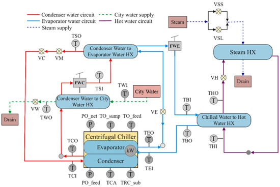The dataset used in this article comes from the ASHRAE RP-1043 chiller fault simulation experiment [28], and the system sketch is shown in Figure 3.