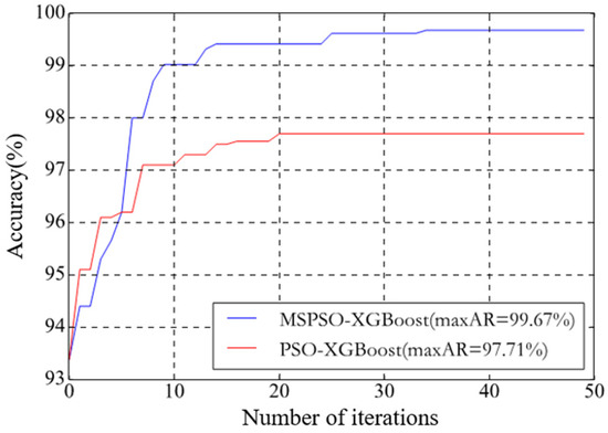 Table 5 shows the optimization results of XGBoost parameters using MSPSO and PSO, respectively. Figure 4 shows the accuracy curves of XGBoost optimized via both methods. As shown in Figure 4, the PSO algorithm has a faster convergence speed in the early stages but it falls into a local optimum at 20 iterations and is unable to escape. The classification accuracy of the XGBoost algorithm optimized using PSO increased from 93.35% to 97.71% after 50 iterations. The MSPSO algorithm has a slow convergence speed in the early stages but particles search for the optimal solution through multi-group cooperation, which can effectively prevent the local optima [29]. The accuracy of the XGBoost optimized using MSPSO can be considerably enhanced when compared to the PSO-optimized version. The classification accuracy of the MSPSO-optimized XGBoost algorithm is now 99.67%, up from 93.35% previously.