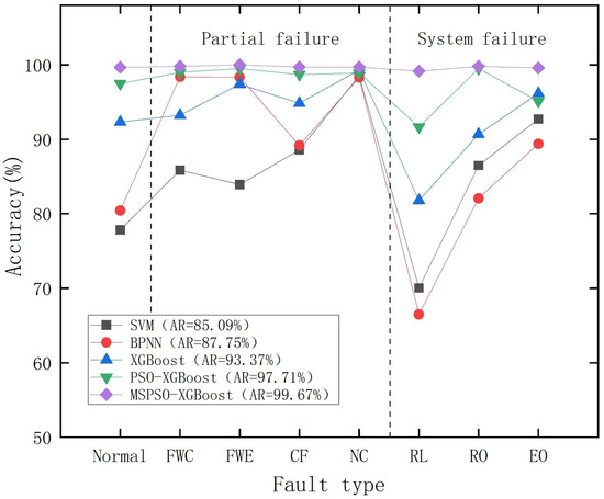 Figure 5 illustrates the diagnostic accuracy of fault models that were trained using the same dataset with the SVM, back propagation neural network (BPNN), XGBoost, PSO-XGBoost, and MSPSO-XGBoost algorithms for eight distinct states. The SVM and the BPNN parameter sets are shown, and the parameters are listed in Table 6 and Table 7. The AR in Figure 5 represents the overall diagnostic accuracy of the five models.