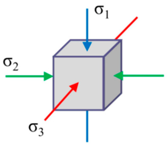 (1) The maximum shear stress is defined directly (see Equation (1a)). Then, the corresponding shear stresses and axial stresses are converted into the axial stresses, based on the Mohr Circles theory (see Equation (1b)).