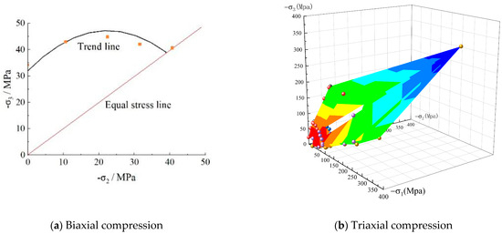 Figure 2a, which reveals a parabolic relationship between the two stresses. With the increase in the middle axial stress, the maximum axial stress initially increases, followed by a decreasing trend. Based on the relationship between the two axial stresses, the different stress combinations can be analyzed to draw the following conclusions: (1) the middle stress is an important factor for the limit conditions of concrete because the maximum stress changes with the middle stress; (2) the single stress differences (i.e.,
