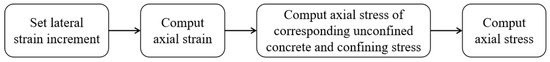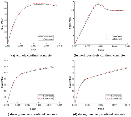 Figure 9. The verification results show that the proposed model can provide accurate prediction results and have wide applicability. However, the proposed model has many limitations, and can only apply to ordinary concrete. The accurate mode should be based on an extensive reasonable database. Afterward, future research should analyze the mechanical mechanism and identify the key influence factors. In this model, the elastic model of confined concrete is 30 GPa. The yield function is shown in Equation (5b), where