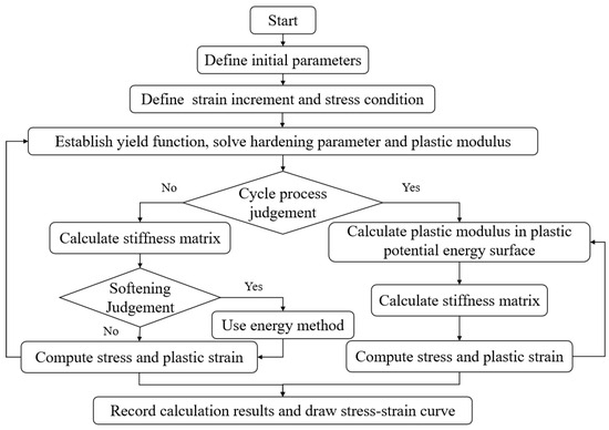 In the proposed derivation process, some initial parameters should be set first, including the elastic matrix, the calculation method of the yield function and plastic modulus, the strain increment (dε), and targeted strain path. Then, plastic strain increment should be calculated by the current stress condition and the corresponding calculation method. Finally, the stress increment should be calculated by the plastic strain, and the new stress condition is updated to begin the new cycle steps. The detailed process of the proposed constitutive model can be established by the following steps: