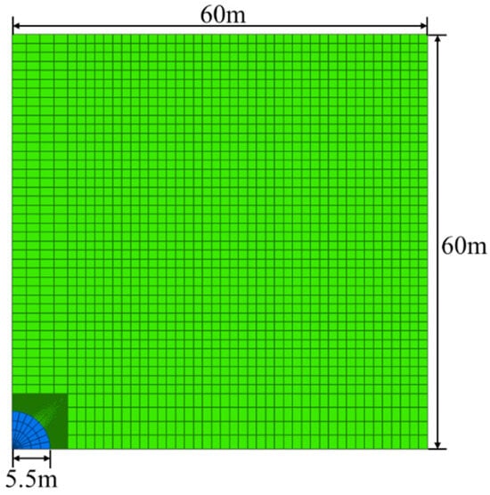 The finite difference software FLAC3D 5.0 is adopted to simulate the tunnels in this study. Figure 1 illustrates the dimensions and geometry of a quarter of the numerical calculation model. The model dimensions are 120 m along the transverse axis of the tunnel (X-direction), 120 m along the vertical axis (Z-direction), and 0.5 m along the longitudinal axis (Y-direction), simplifying the tunnel excavation into a two-dimensional plane strain problem. The model boundaries are fully constrained, and the tunnel burial depth and excavation radius vary based on the working conditions. The rock mass follows an ideal elastic–plastic yielding criterion, with parameters determined using the Hoek–Brown formula and considering rock mass quality classification. Initial ground stress is represented by a static stress field influenced solely by self-weight stress. The horizontal stress is calculated using the well-known Jaky’s equation [] based on the internal friction angle of the rock mass (K0 = 1 − sinφ), where K0 is the coefficient of static earth pressure and φ is the internal friction angle. The lining system includes steel arches, steel mesh, shotcrete, and grouted rock bolts.