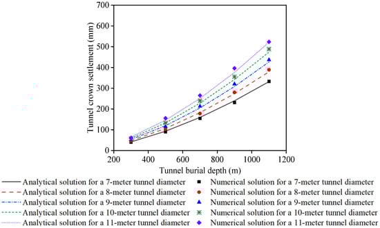 To validate the accuracy of the established model using the finite different method, comparisons with the analytical methods and a case study are carried out, respectively. Figure 2 presents a comparison of radial displacements obtained from numerical simulations conducted in this study with the analytical solution proposed by Carranza-Torres []. The physical parameters of the rock mass are obtained from the Engineering Rock Mass Classification Standard [], where the elastic modulus of the rock mass is 0.66 GPa, the cohesion is 0.26 MPa, the internal friction angle is 27.9°, the Poisson’s ratio is 0.45, and the unit weight is 19.8 kN/m3. The comparison encompasses tunnel burial depths ranging from 300 m to 1100 m and diameters ranging from 7 m to 11 m. The comparisons depicted in Figure 2 reveal a good agreement between the outcomes derived from the numerical model in this study and those proposed by Carranza-Torres []. This alignment indicates that the established model employed for estimating the deformation of fully excavated tunnels with varying burial depths and diameters demonstrates sufficient accuracy.