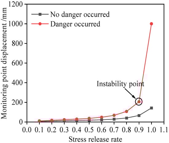 - Extract the displacement corresponding to the stress release stage at the limit state of instability. This serves as the warning value of displacement (Figure 4).