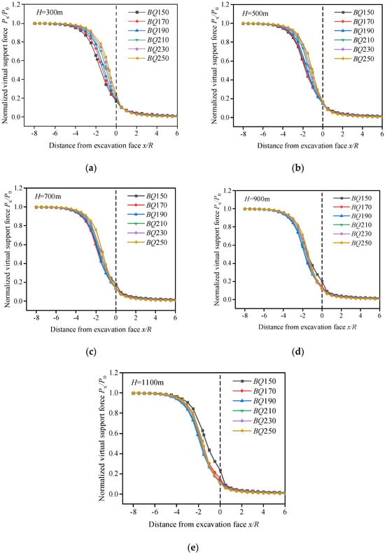 Tunnel excavation poses spatial challenges due to three-dimensional constraints, with semi-circular vault-shaped limitations longitudinally and annular constraints laterally. These constraints hinder the immediate release of elastic–plastic deformations near the excavation face. A virtual support force is added to represent this spatial constraint effect and to simplify tunnel excavation analysis as a plane strain problem. It is observed when a specific tunnel section is excavated, resulting in immediate and continuous convergence displacement. This deformation is arrested by applying a radial force against the tunnel wall, known as the virtual support force. As the excavation face moves away from the section under scrutiny, the virtual support force gradually diminishes until it reaches zero. Previous investigations showed that tunnel excavation can be simplified as a continuous decrease in virtual support force alongside the continuous increase in rock displacement. Upon reaching the limit state of the surrounding rock, the tunnel experiences a significant increase in displacement following a minor stress release. Subsequent displacements at monitoring points can be assessed based on the variation of displacement with the virtual support force. In this study, the slope represents the deformation velocity of the tunnel, indicating the ratio of displacement at the monitoring point to the released virtual support force. Sun [] derived a comprehensive expression for the virtual support force, allowing for the determination of its variation curve with excavation distance under different working conditions. Based on Sun’s method [], various variation curves for V-grade rock masses (BQ = 150~250) at burial depths ranging from 300 m to 1100 m are illustrated in Figure 5, providing detailed data for researchers to analyze. Furthermore, the deformation velocity of the tunnel curves versus the distance from excavation face are showed in Figure 6, with various values of V-grade rock masses at burial depths from 300 m to 1100 m. It can be observed from the curves that the maximum deformation velocity shows a significant increase with the crucial depth. By using these curves, researchers can determine the virtual support force and deformation velocity at any point during tunnel excavation under varying burial depths. The results from these curves are crucial for assessing rock mass stability and support design during tunnel excavation, offering valuable guidance for tunnel design and construction in practical engineering projects.