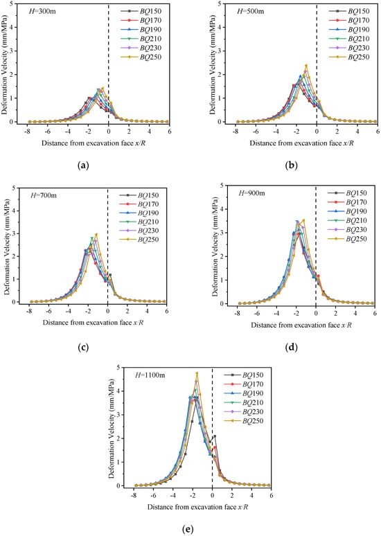Longitudinal distribution curve of deformation velocity: (a–e) represent deformation velocity values for V–class surrounding rock at burial depths of 300 m, 500 m, 700 m, 900 m, and 1100 m, respectively.