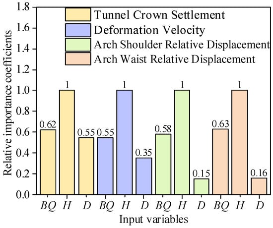 Figure 8 illustrates the results of the sensitivity analysis performed on the influencing factors of the selected warning indicators. Among the input variables, tunnel burial depth emerges as the most critical parameter for crown settlement, deformation velocity, relative displacement at the crown shoulder, and relative convergence at the crown waist. Conversely, the influence of tunnel diameter is relatively minor. Specifically, for relative displacement at the crown shoulder and waist, the relative importance coefficients are only 0.15 and 0.16, respectively. The BQ value, representing the quality of the tunnel rock mass, holds a central position. Its relative importance coefficients are 0.62, 0.55, 0.58, and 0.63 for crown settlement, deformation velocity, relative displacement at the crown shoulder, and relative convergence at the crown waist, respectively.