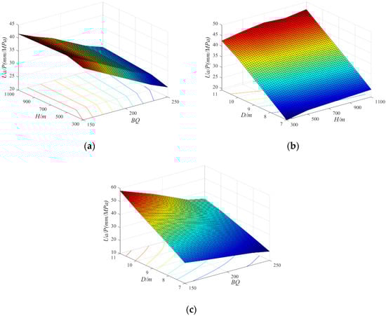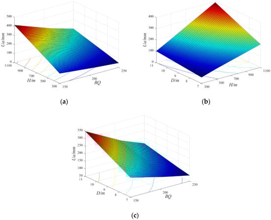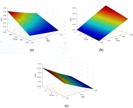 The interactive effects of tunnel rock mass quality index BQ, tunnel burial depth H, and diameter D are considered. These effects on crown settlement, relative displacement at the crown shoulder, relative displacement at the crown waist, and deformation velocity are analyzed separately, as depicted in Figure 9, Figure 10, Figure 11 and Figure 12. The results indicate that for small burial depths, large BQ values, and small tunnel diameters, the ultimate displacement and deformation velocity show minimal variation. With decreasing rock mass quality, tunnel burial depth and diameter increase, leading to continuous increases in ultimate displacement and deformation velocity. Conversely, improvements in rock mass quality, accompanied by decreases in tunnel burial depth and diameter, result in steady decreases in ultimate displacement and deformation velocity. Utilizing the response surfaces of ultimate displacement enables the efficient evaluation of these parameters under specific conditions of rock mass quality, tunnel burial depth, and tunnel diameter.