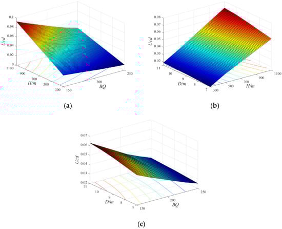 Response surface of maximum deformation velocity: (a–c) are the response surfaces of deformation velocity with respect to variations in H and BQ, D and H, and D and BQ, respectively.