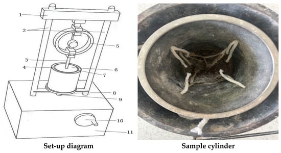 Device design drawing. 1—beam; 2—support column; 3—cover plate column; 4—water injection cylinder; 5—force ring; 6—cover plate; 7—sample cylinder; 8—bearing platform; 9—lifting column; 10—bearing platform height adjustment wheel; 11—base.