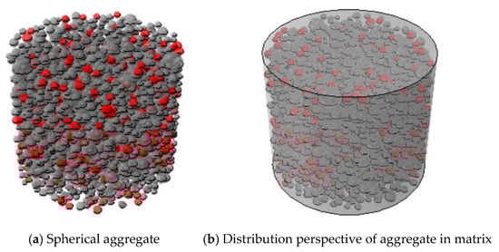 Based on the random aggregate model method, scholars have conducted in-depth research on aggregate shape and delivery. Qin et al. [] studied a random placement algorithm of a three-dimensional convex aggregate and put forward the idea of the homogenization of the placement area. Guan et al. [] used an ellipsoidal aggregate particle model to simulate multiphase composite materials, and they proposed a finite element mesh generation algorithm for aggregate surfaces based on a mapping method. Qin et al. [] applied CT slicing technology to three-dimensional modeling. The above research has further refined the mesoscopic aggregate model.