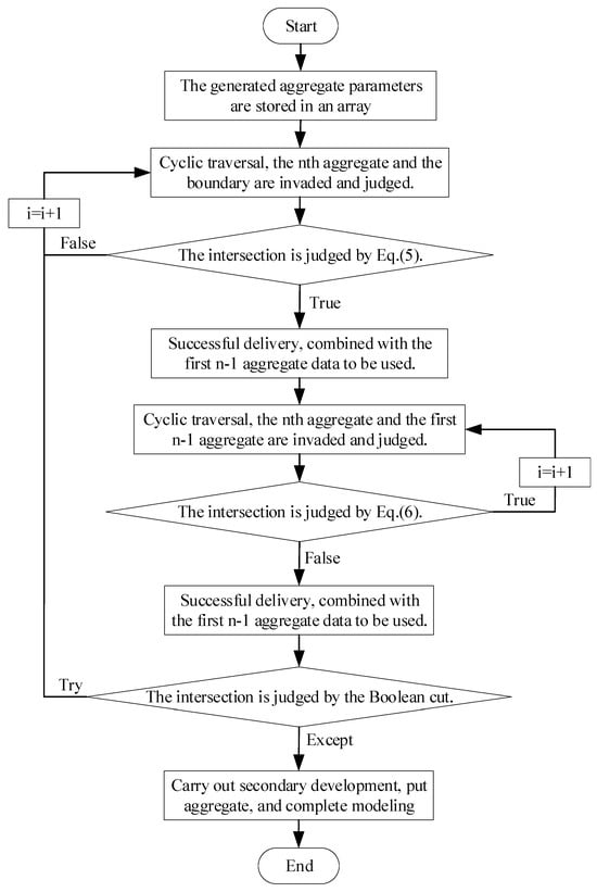 Step 4: The valid data stored in the third step are circulated and traversed by for in range ( ), and the intrusion discrimination between sand and sand aggregate, sand and loess aggregate, loess and loess aggregate is carried out in turn. The judgment formula is shown in Equation (6). If it is False, the aggregate does not intersect with the previous aggregate (successful test). If it is True, the aggregate intersects with the previous aggregate (failed test).