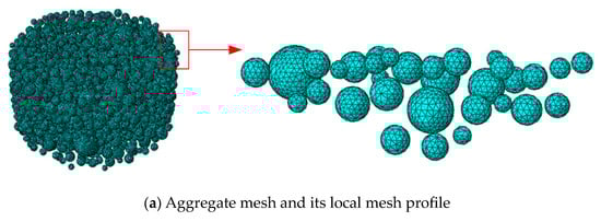 Due to the large number of aggregated components and grid generation units, more computing environments and computing time may be required. The element meshing of the sphere is relatively simple, and there is no need to add nodes for integral calculation. Therefore, the four-node linear tetrahedral element (C3D4) is used in this paper to facilitate the simulation calculation. In summary, the generated mesoscopic model is meshed, and the mesh results of the aggregate and matrix are illustrated in Figure 5.