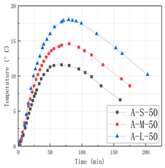 There are many parameters that affect the performance of a lime–sand pile, among which the mix ratio has a certain influence on the performance of a lime–sand pile. Based on this, the research group carried out an expansion force and temperature test of lime/sand/loess with different mixing ratios of 4:5:1, 5:4:1 and 6:3:1. The lime particle size was 1 mm and the sample height was 50 mm. The first part of the name of the test piece ‘A’ represents the normalized lime; the second part is the mix ratio: ‘S’ represents 4:5:1, ‘M’ represents 5:4:1, ‘L’ represents 6:3:1; and the third part is the height of the test piece. The temperature rise curves under different mix ratios are obtained as shown in Figure 6.