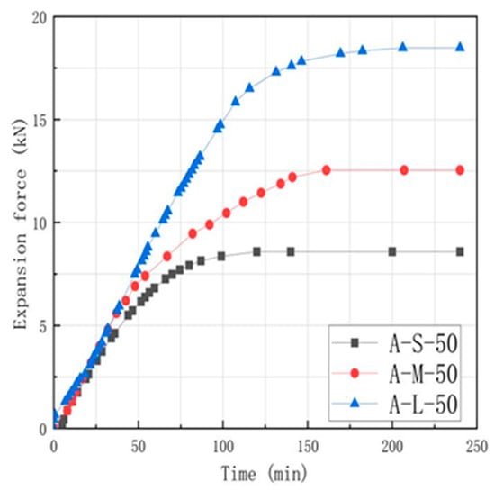 After the test reaches the stable stage, the average expansion forces of A-S-50, A-M-50, and A-L-50 are 8.58 kN, 12.37 kN, and 18.48 kN respectively. With the increase in lime proportion, the expansion force increases by about 45%.