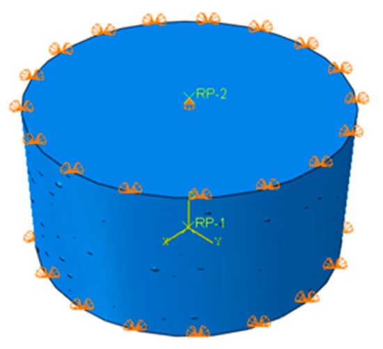 In this paper, the verified mesoscopic parameters and the temperature rise curve obtained from the test (Figure 6) are input into the model as temperature loads. The dynamic explicit analysis method is used to set the analysis step. The specific way of loading and constraint is to couple the reference points RP-1 and RP-2 on the upper and lower bottom surfaces and add the corresponding boundary conditions (U3 = 0) so that the cylinder cannot move in the Z direction. The corresponding boundary conditions (U1 = 0, U2 = 0) are applied to the cylinder so that it cannot move in the X and Y directions. Under the action of temperature load, parameters such as stress, strain, displacement, and reference point reaction force are required to be output. The specific loading diagram is depicted in Figure 8.