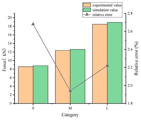 Using the parametric modeling method, similar to the previous loading method, the expansion reaction force of different height specimens of lime–sand piles under the corresponding temperature load is obtained. Compared with the test, the summary results are shown in Table 6, as shown in Figure 13.