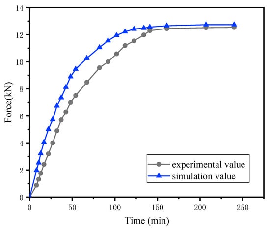 The expansion reaction force of different mix ratios of a lime–sand pile under the corresponding temperature load is obtained. Compared with the test, the summary results are shown in Table 5, as shown in Figure 9. Taking the 5:4:1 mixture ratio as an example, the variation curve of the expansion reaction force of the lime–sand pile with time is simulated, and the test is shown in Figure 10.