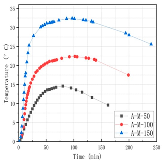 It can be seen from the time–temperature curve in Figure 11 that the reaction rules of the three groups of samples are basically the same, and the curves are divided into a rising stage and a falling stage. The temperature rising peaks of A-M-50, A-M-100, and A-M-150 are 14.5 °C, 22.3 °C, and 32.3 °C. As the height of the sample increases, the heat release rate of the lime–sand pile in the early stage is also faster, and the reaction heat release also increases. For every 50 mm increase in height, the heat release temperature also increases by 30–35%. The lime digestion and exothermic process of A-M-50, A-M-100, and A-M-150 absorbed 400 mL, 490 mL, and 700 mL water, respectively, and the water absorption rate increased continuously. The curve data are used for model temperature load setting.