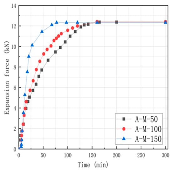 When the test reaches the stable stage, the expansion forces of A-M-50, A-M-100, and A-M-150 are 12.37 kN, 12.42 kN, and 12.33 kN respectively. The final expansion force difference of each sample is within ±0.1 kN, indicating that the change in height has no significant effect on the expansion force.