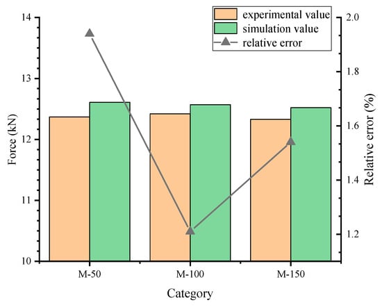 After the simulation, the expansion forces of A-M-50, A-M-100, and A-M-150 are 12.61 kN, 12.57 kN, and 12.52 kN, respectively. It can be seen from the simulation results that the difference between the expansion force of lime–sand pile and the test results is within ±0.3 kN, indicating that the change in height has no obvious influence on the expansion force, which is consistent with the test law. This may be due to the fact that the lime–sand particles and the reactants in the hydration reaction can be evenly distributed in the sample and reach a similar degree of reaction. Based on the mesoscopic model generated by the algorithm in this paper, the expansion reaction force of the specimens at different heights is similar to the experimental results of the laboratory specimens, with a relative error below 2%, which further shows that the mesoscopic model of lime–sand pile proposed in this paper has certain reliability in simulating the mechanical properties of lime–sand piles.