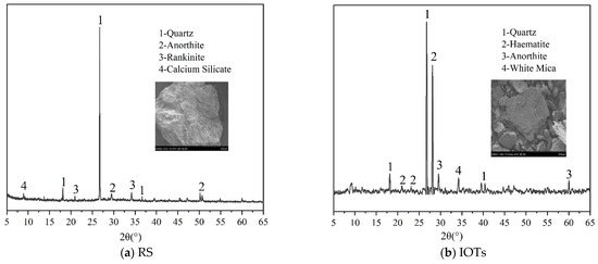 The coarse aggregate (NCA) used in this study consisted of crushed stone from Xi’an. The fine aggregate comprised Chanhe River sand (RS) and IOTs. Within Table 2, the key physical properties of both coarse and fine aggregates are detailed. Meanwhile, Figure 1 showcases the principal components and micro-morphology of RS and IOTs, as analyzed via X-ray diffraction (XRD) and scanning electron microscopy (SEM). It found that the crystal composition tested by XRD of RS and IOTs is mainly quartz, and chemical activity was steady, and the SEM results found that IOTs had more angular surfaces than that of RS. According to the Chinese national standard (GB/T14684-2011) [40], Figure 2 displays the aggregation curves of both coarse and fine aggregates. It can be observed that the sieve size of IOTs was smaller than that of RS.