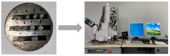 Micro-morphology testing included sampling from 100 mm × 100 mm × 100 mm cube blocks subjected to various sulfate F–T cycles. Preceding analysis with the S-4800 cold field emission SEM, as shown in Figure 5, the samples, approximately 5 mm × 5 mm × 2 mm in size, were subjected to pretreatment involving drying at 40 °C for 24 h and gold spray coating.